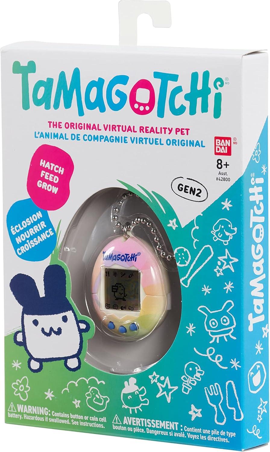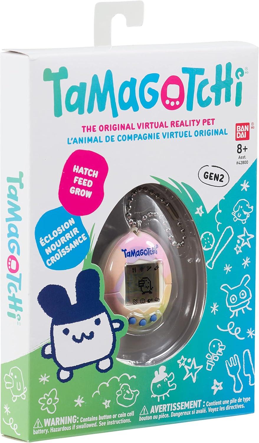 The shell has pastel bubbles with a white frame and blue 'Tamagotchi' and buttons, and generation 2 programming and characters